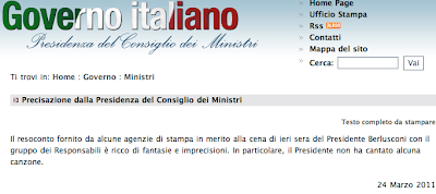 Se non avete ancora provato l'ebbrezza di andare sul sito del governicchio italiano, vi consiglio di leggere lo strampalato comunicato stampa del 24 marzo che, a memoria d'uomo, nemmeno in una bocciofila dei pensionati avrebbero il coraggio di pubblicare in bacheca quando l'aspirante tenore in pensione da buca alla consueta cena settimanale dopo il torneo di briscola a causa di un imprevisto episodio di flatulenza.
